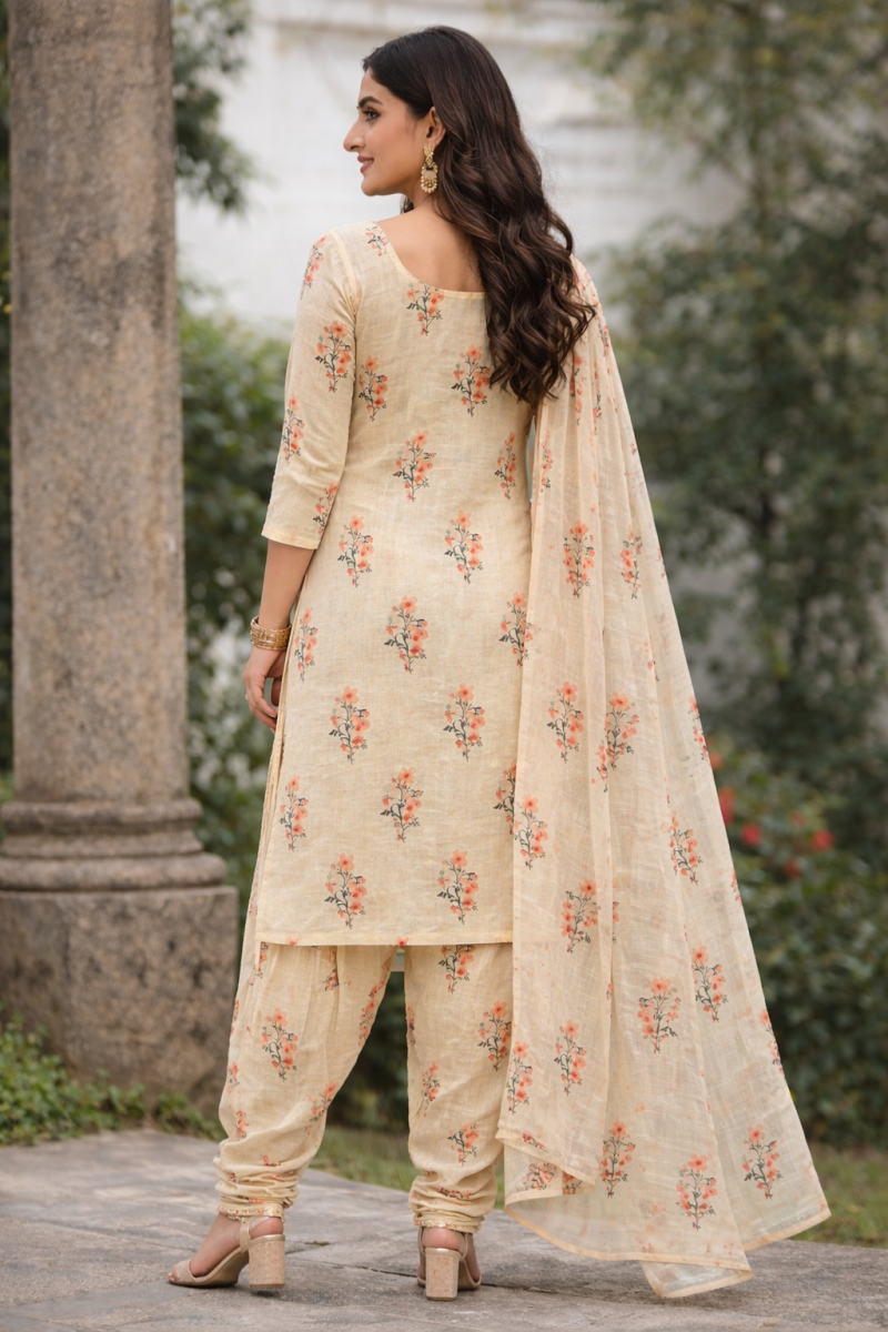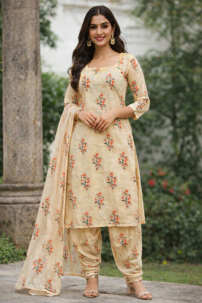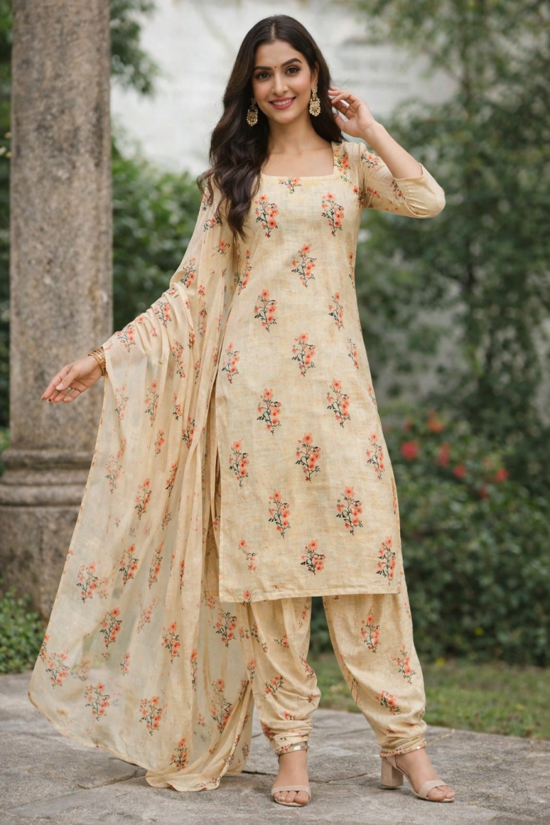 This Floral Printed Cotton Kurta Pant Dupatta Set is a timeless addition to your wardrobe, offering effortless elegance with unmatched comfort.